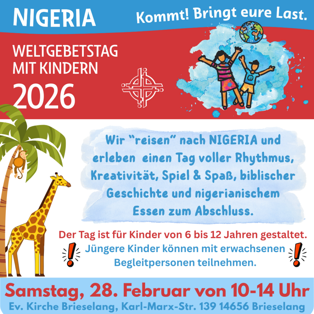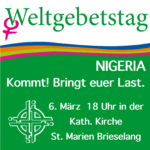 Am Freitag, den 6. März 2026, feiern wir um 18:00 Uhr Weltgebetstag in der St. Marienkirche der katholischen Kirchengemeinde Brieselang – Birkenweg 19. „Kommt! Bringt eure Last.“ Zum Weltgebetstag 2026 aus Nigeria Nigeria ist das bevölkerungsreichste Land Afrikas – vielfältig,… weiter …Weltgebetstag 2026